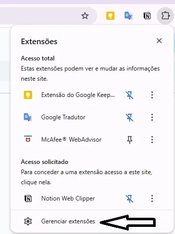 1. Haga clic en los tres puntos situados en la esquina superior derecha de la pantalla y seleccione la opción Extensiones > Administrar extensiones.
