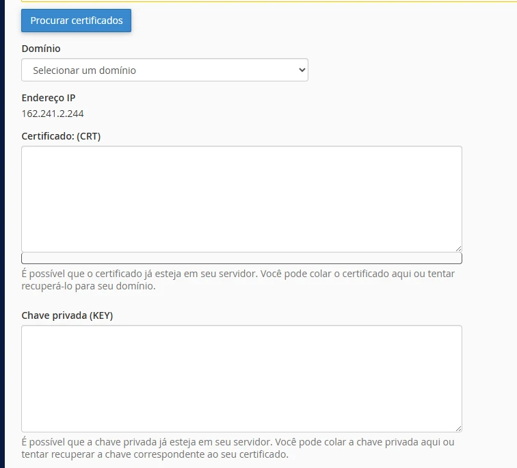 1. A Em seguida, escolha o domínio no qual a documentação será instalada e insira o arquivo .crt e a chave privada.